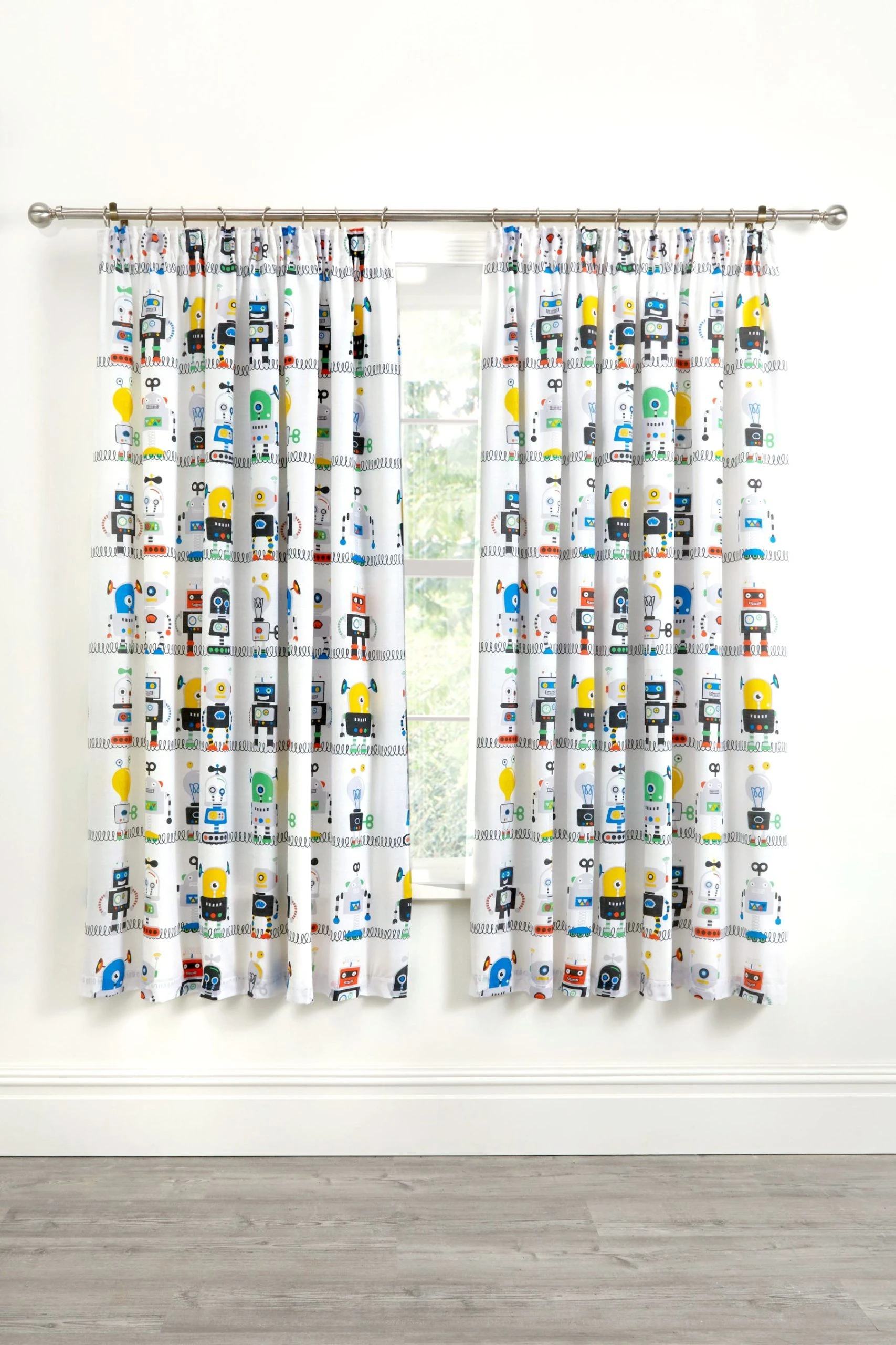 Take a trip into a fun and friendly future with these kids curtains, featuring a line-up of playfully parading robots. Featuring plenty of colourful details and a host of friendly faces that are perfect for his bedroom day and night.