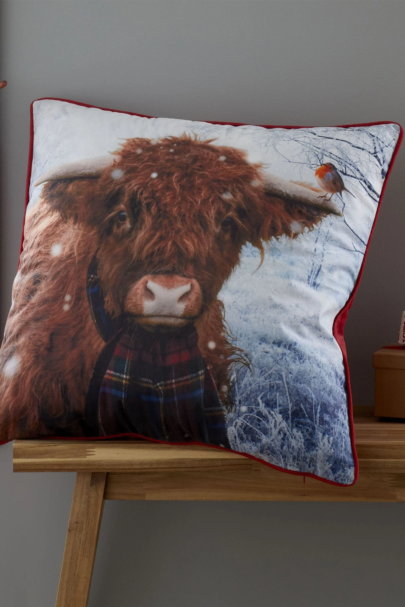 Catherine Lansfield is renowned for style and quality – designed and developed in Great Britain. Our winter highland cow is ready for a very Happy Christmoo. This cushion is set on a winter soft to-touch background, with the cow sporting fun novelty antlers. Ethically sourced overseas and made to quality and human-ecological safety standards. Made from 100% Polyester.Machine Wash at 30 Degrees. Filled Cushion- 55x55cm. Search ‘Catherine Lansfield Highland Cow’ to see the full collection.