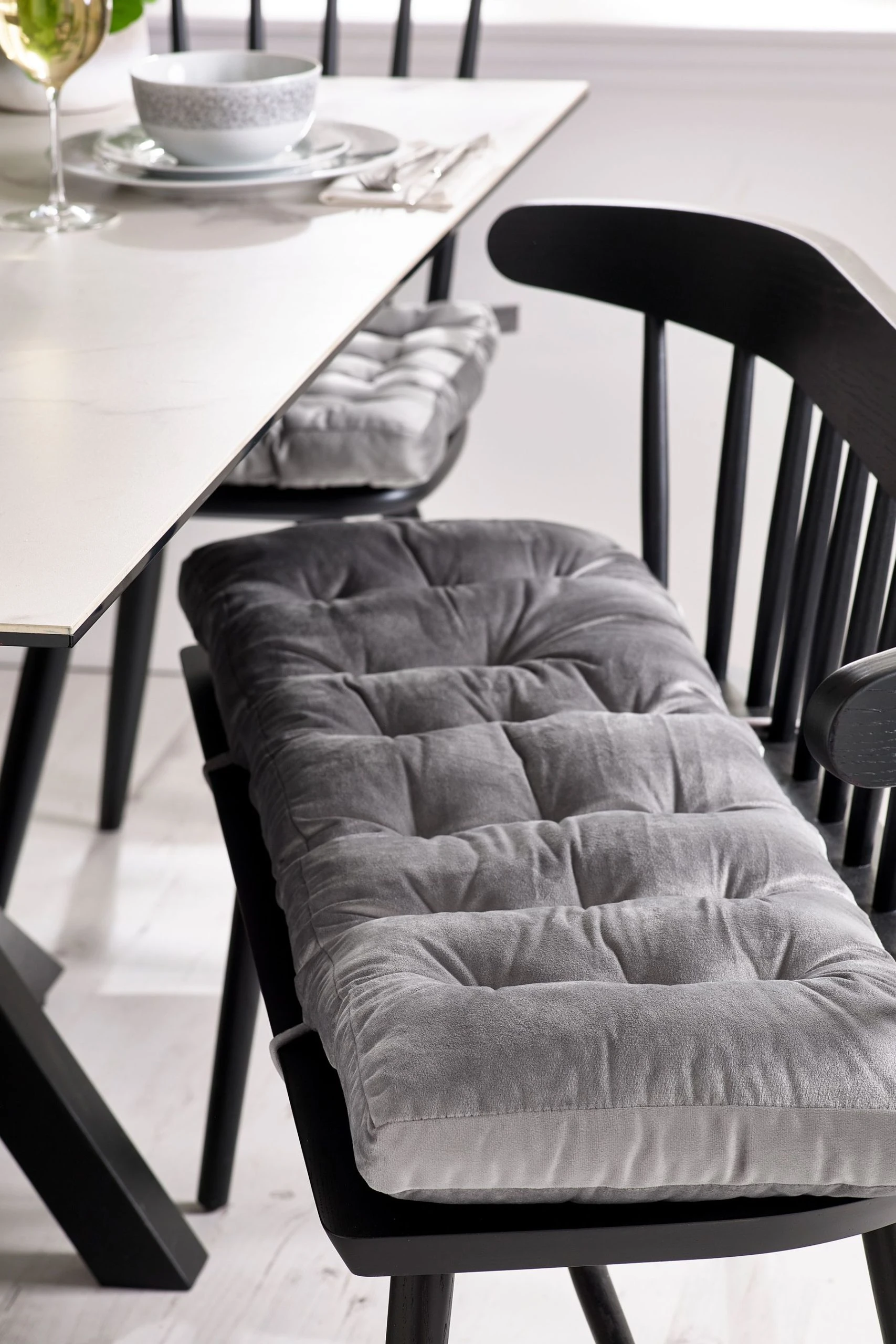 Our velvet bench pads are a luxurious way to add comfort to your dining table. Part of our luxury velvet collection, available in a variety of colours and styles including napkins and tablecloths. Small – 110cmx30cm. Large – 150cmx32cm. Sponge clean only. Main 100% Polyester. Filling 100% Polyester.