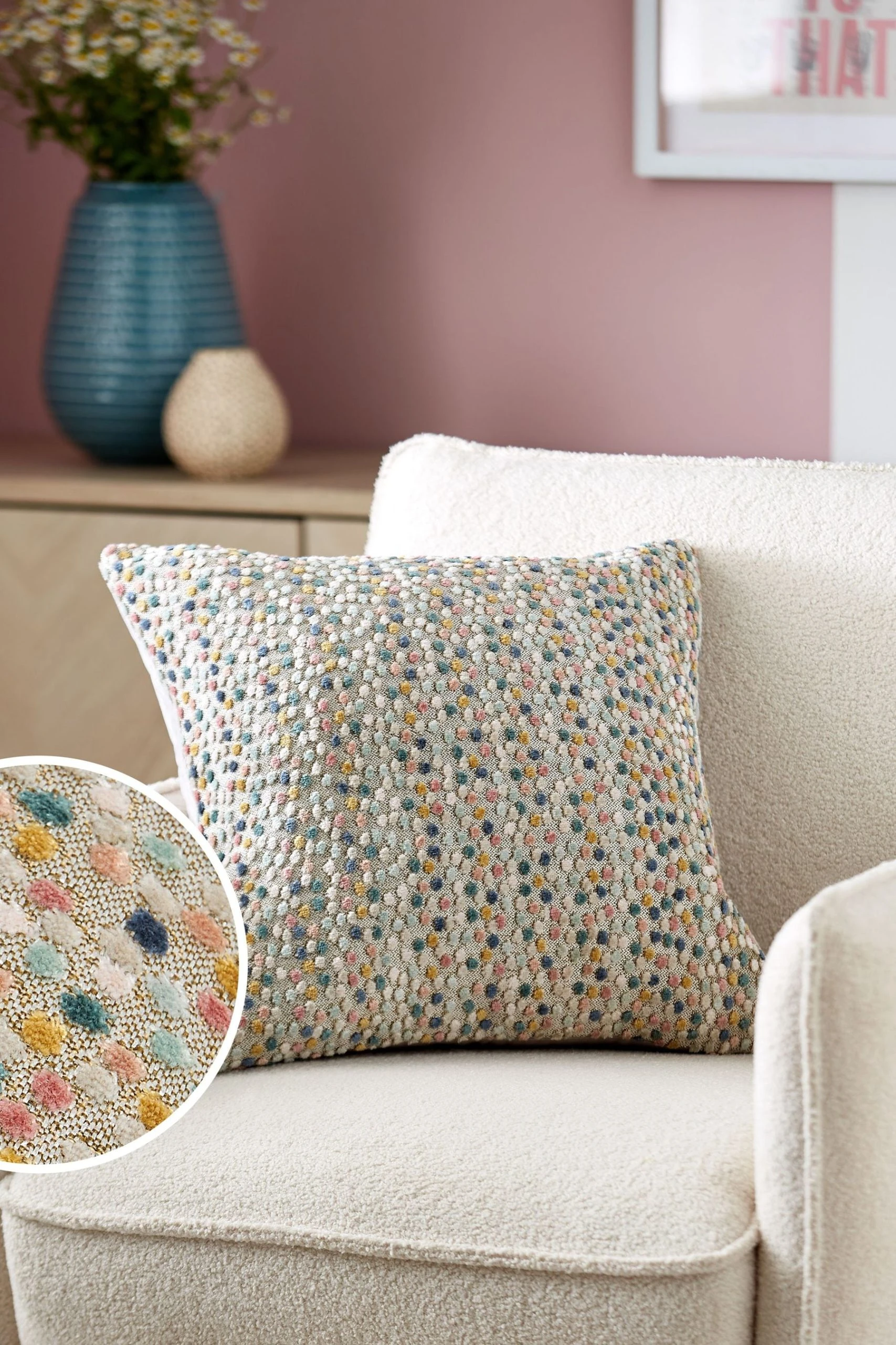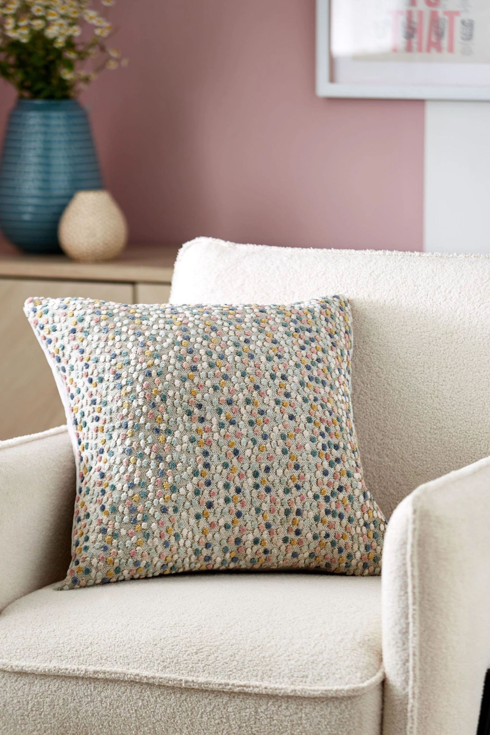 On the dot, this cushion delivers a pop of colour to any space. Designed with luxury cut velvet and a velvet reverse for an opulent touch. Made in the UK.