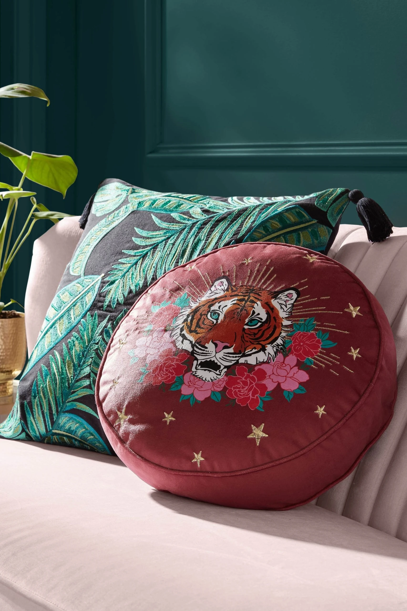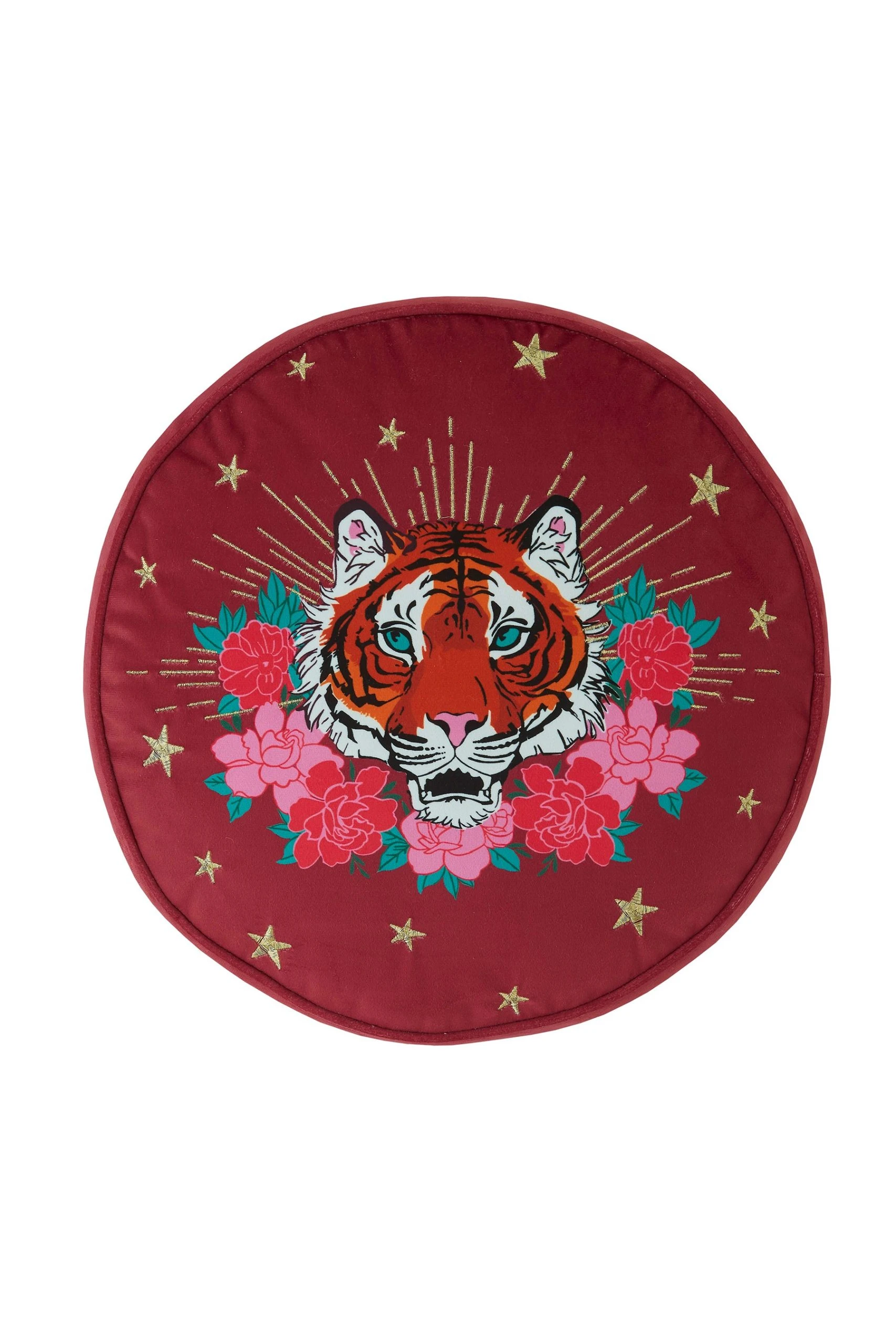 Designed in this deep pink shade, add some attitude into your favourite space with this fierce Tiger Cushion. Material: 100% polyester velvet. Dimensions: 45cm diameter . – Tiger print velvet cushion- Gold embroidered detailing – Piped edges- One-sided design- Pre-filled